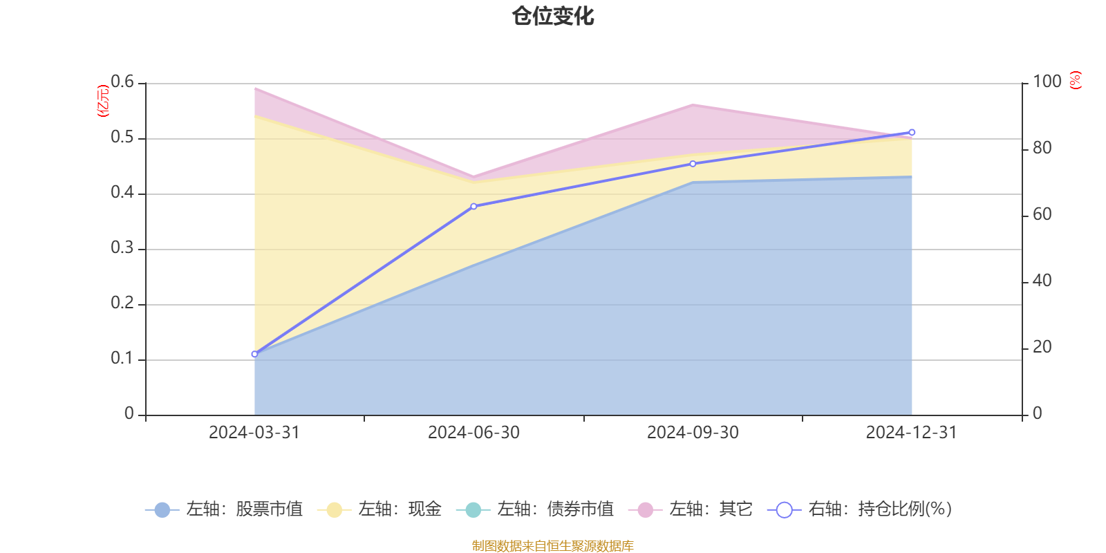 据定期报告数据统计,成立以来平均股票仓位为60.47%,同类平均为83.33%。2024年末基金达到85.13%的最高仓位,2024年一季度末最低,为18.28%。