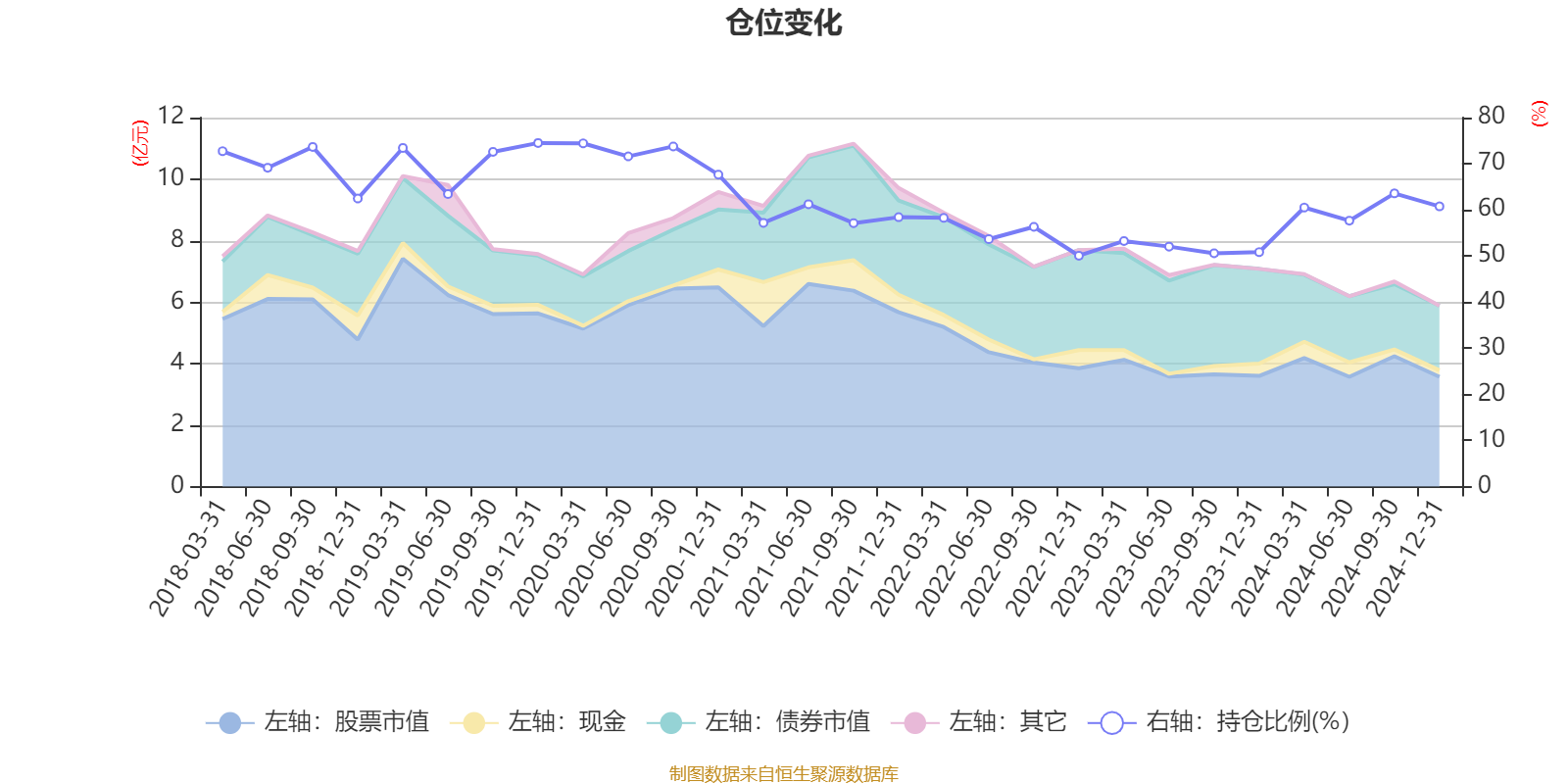 据定期报告数据统计,近三年平均股票仓位为55.62%,同类平均为41.4%。2019年末基金达到74.5%的最高仓位,2022年末最低,为50.05%。
