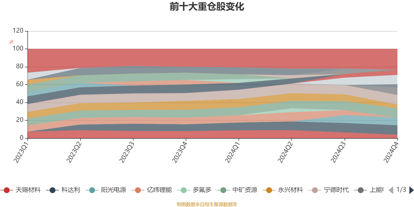 该基金持股集中度较高,近2年前十大重仓股集中度长期超过60%。截至2024年四季度末,基金十大重仓股分别是宁德时代、德业股份、科达利、中矿资源、阳光电源、上能电气、锦浪科技、永兴材料、天赐材料、中信博。