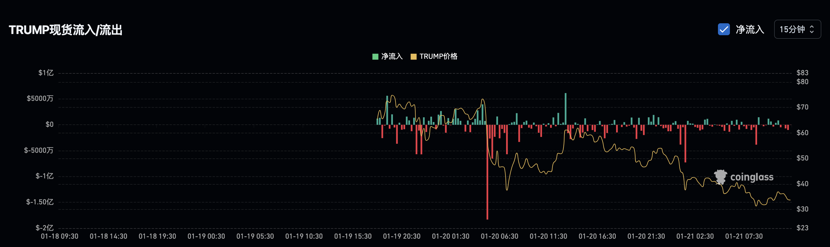 特朗普所推出的个人Meme币TRUMP,在上市后一度创下75.35美元(累计涨幅逾41200%)的高点后开始下跌,过去24小时内持续震荡下跌。