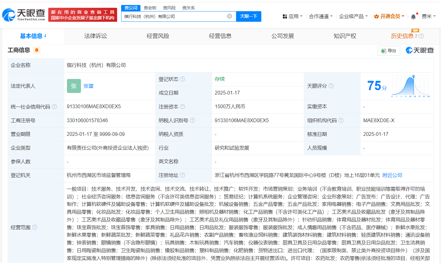 每经AI快讯,天眼查App显示,近日,棋行科技(杭州)有限公司成立,法定代表人为张雷,注册资本1500万元人民币,经营范围含社会经济咨询服务、贸易经纪、计算机系统服务、企业管理咨询、企业形象策划、广告发布等。股权全景穿透图显示,该公司由薯阅信息科技(上海)有限公司全资持股,后者为小红书关联公司Redbook Holdings Limited全资子公司。