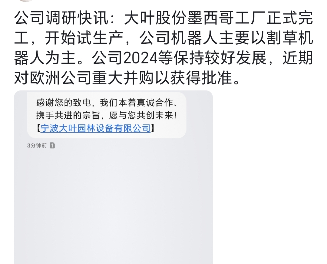 趋势:机器人产业细分关注具有世界龙头企业潜力公司大叶股份等投资机会。公司近期并购欧洲公司获得批准,北美墨西哥工厂正式落成开始试生产,公司的机器人割草机将成为世界龙头企业。