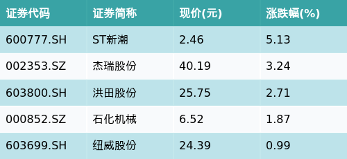 截至收盘,页岩气主题涨跌幅最高的五只股票为:ST新潮(600777.SH)、杰瑞股份(002353.SZ)、洪田股份(603800.SH)、石化机械(000852.SZ)与纽威股份(603699.SH)。详情见下表: