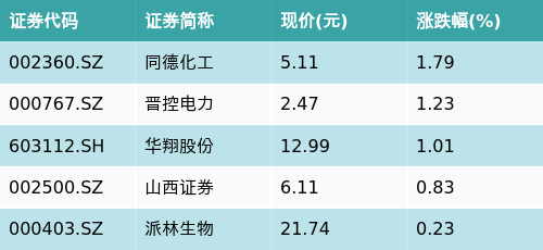 截至收盘,山西主题涨跌幅最高的五只股票为:同德化工(002360.SZ)、晋控电力(000767.SZ)、华翔股份(603112.SH)、山西证券(002500.SZ)与派林生物(000403.SZ)。详情见下表: