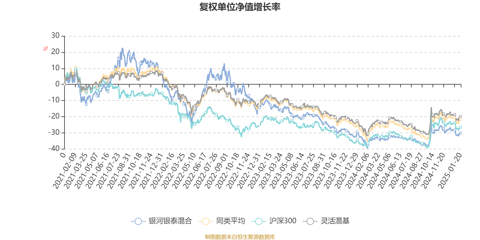 截至1月20日,银河银泰混合近三个月复权单位净值增长率为-1.93%,位于同类可比基金560/920;近半年复权单位净值增长率为4.63%,位于同类可比基金596/920;近一年复权单位净值增长率为6.12%,位于同类可比基金631/920;近三年复权单位净值增长率为-28.54%,位于同类可比基金563/898。