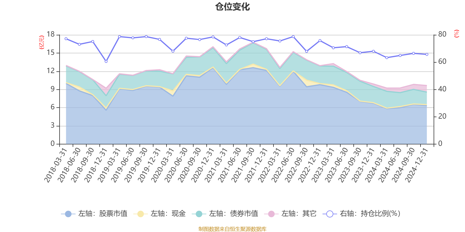 据定期报告数据统计,近三年平均股票仓位为69.54%,同类平均为79.89%。2022年上半年末基金达到78.69%的最高仓位,2018年末最低,为60.5%。
