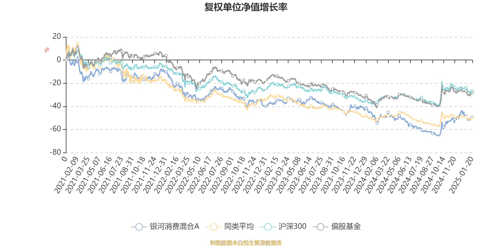截至1月20日,银河消费混合A近三个月复权单位净值增长率为14.16%,位于同类可比基金1/139;近半年复权单位净值增长率为27.36%,位于同类可比基金1/139;近一年复权单位净值增长率为-5.95%,位于同类可比基金113/137;近三年复权单位净值增长率为-38.80%,位于同类可比基金106/117。