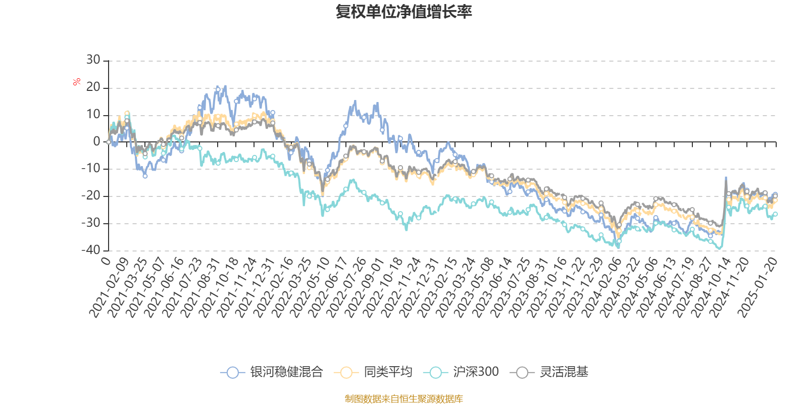 截至1月20日,银河稳健混合近三个月复权单位净值增长率为-0.60%,位于同类可比基金422/920;近半年复权单位净值增长率为12.38%,位于同类可比基金269/920;近一年复权单位净值增长率为18.51%,位于同类可比基金201/920;近三年复权单位净值增长率为-20.07%,位于同类可比基金362/898。