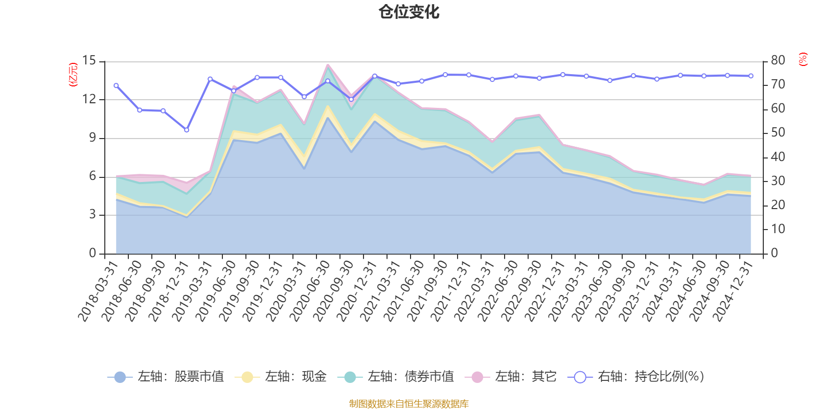 据定期报告数据统计,近三年平均股票仓位为73.56%,同类平均为79.89%。2022年末基金达到74.48%的最高仓位,2018年末最低,为51.49%。