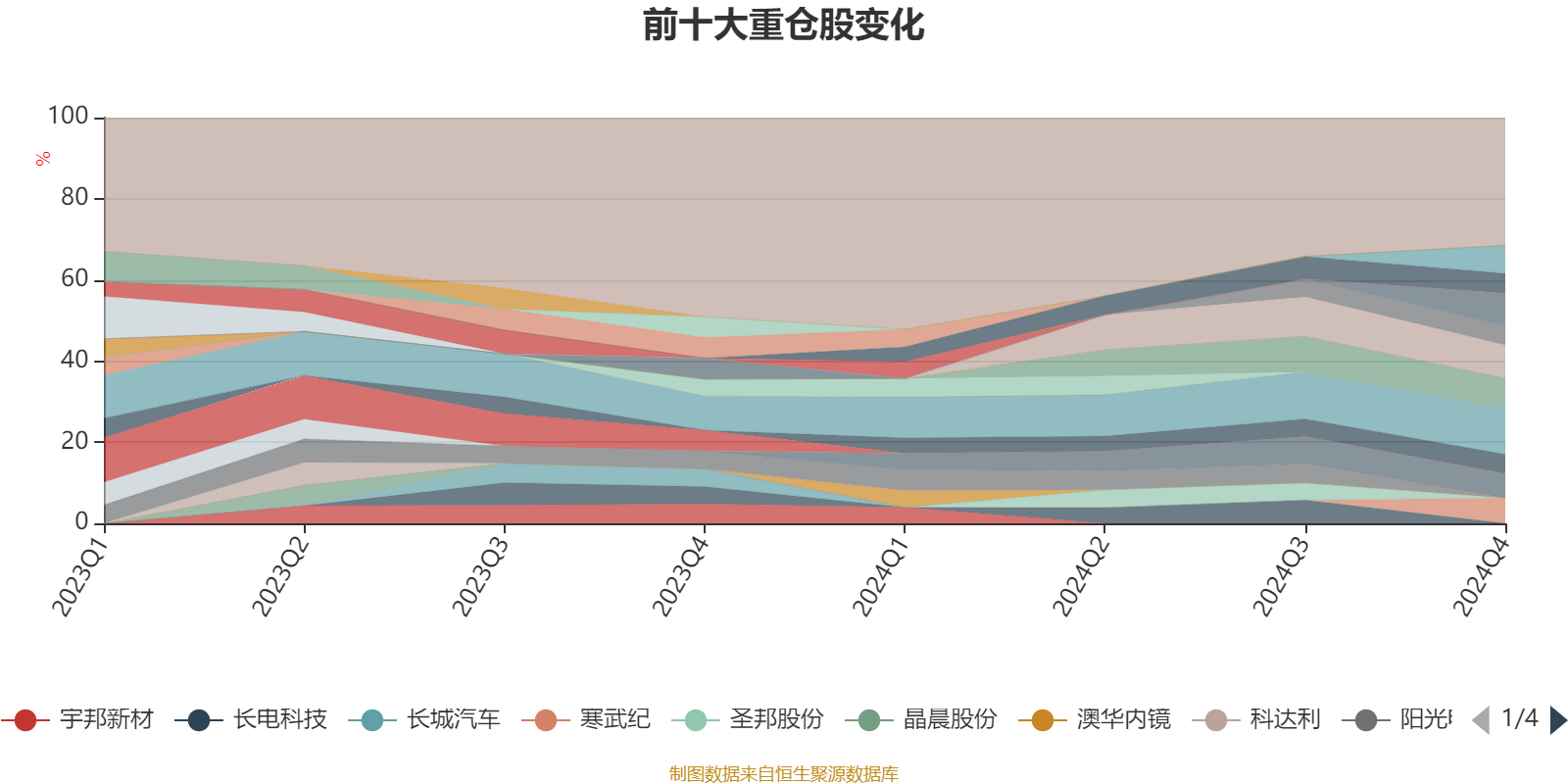 截至2024年四季度末,基金十大重仓股分别是宁德时代、德业股份、中芯国际、中信博、海光信息、寒武纪、北方华创、比亚迪、泰格医药、拓普集团。