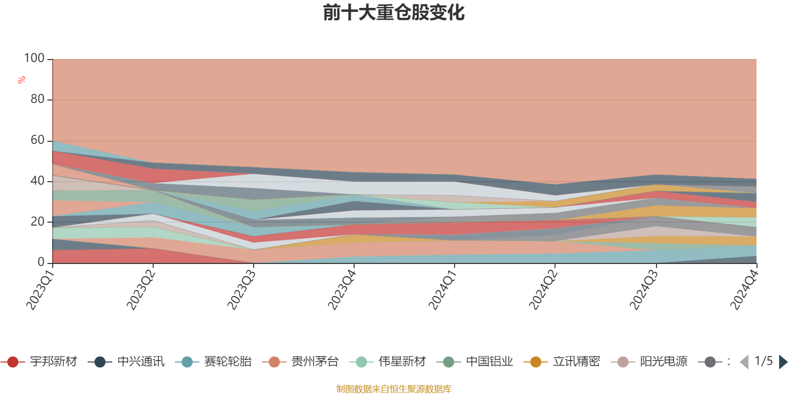 截至2024年四季度末,基金十大重仓股分别是赛轮轮胎、五粮液、中信博、北方华创、立讯精密、中芯国际、航天电器、中兴通讯、通威股份、中航光电。