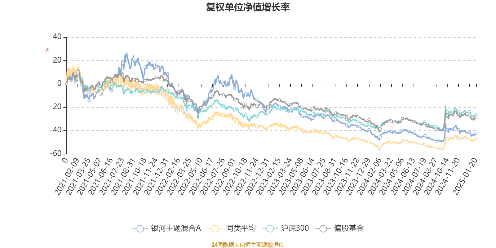 截至1月20日,银河主题混合A近三个月复权单位净值增长率为-5.17%,位于同类可比基金565/646;近半年复权单位净值增长率为3.78%,位于同类可比基金477/645;近一年复权单位净值增长率为4.28%,位于同类可比基金512/633;近三年复权单位净值增长率为-40.94%,位于同类可比基金406/444。