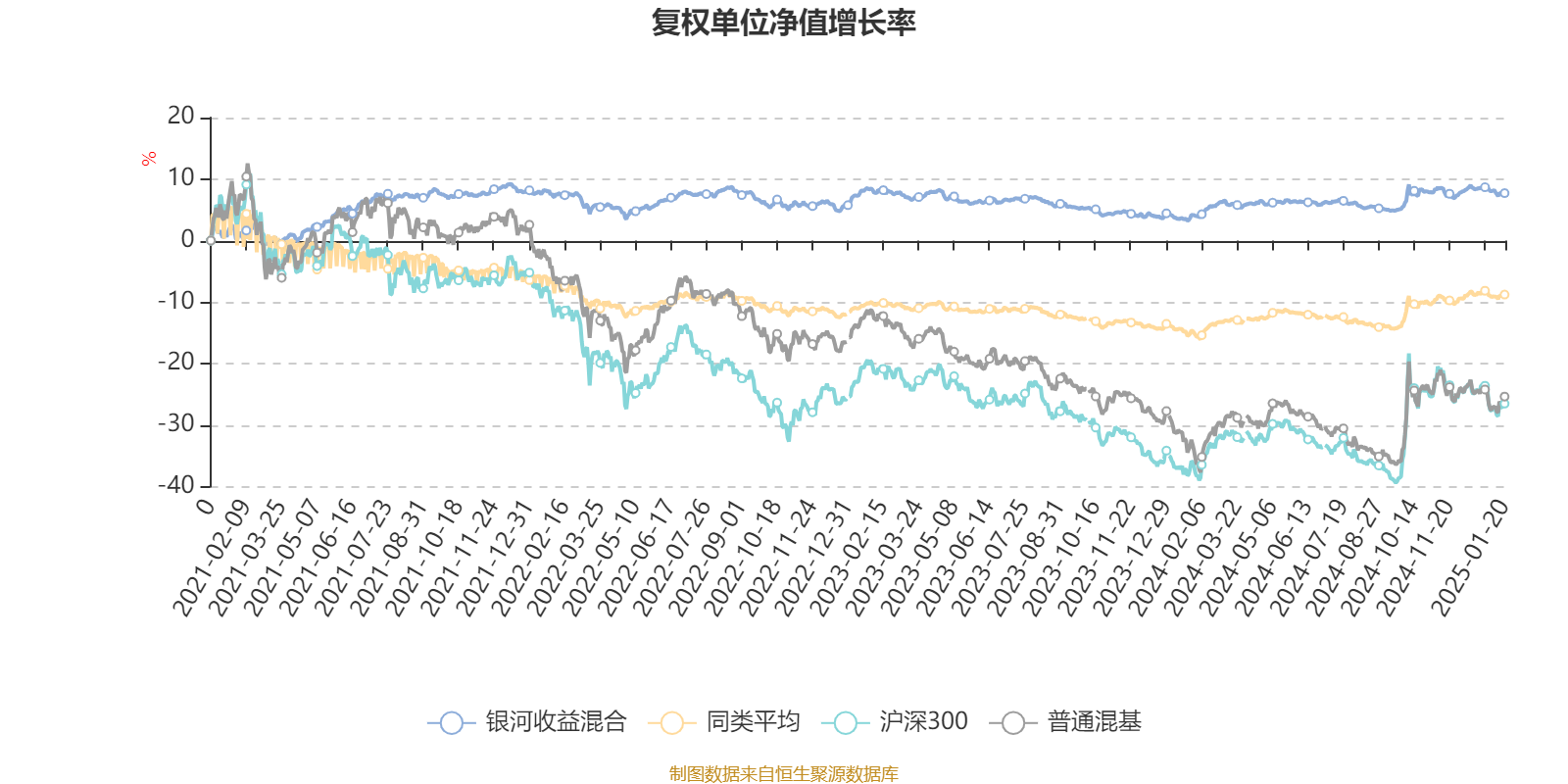截至1月20日,银河收益混合近三个月复权单位净值增长率为-0.53%,位于同类可比基金615/670;近半年复权单位净值增长率为1.17%,位于同类可比基金581/670;近一年复权单位净值增长率为4.07%,位于同类可比基金528/664;近三年复权单位净值增长率为-0.38%,位于同类可比基金352/523。