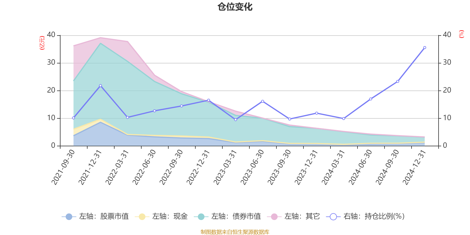 据定期报告数据统计,近三年平均股票仓位为15.56%,同类平均为18.69%。2024年末基金达到35.55%的最高仓位,2023年一季度末最低,为9.48%。