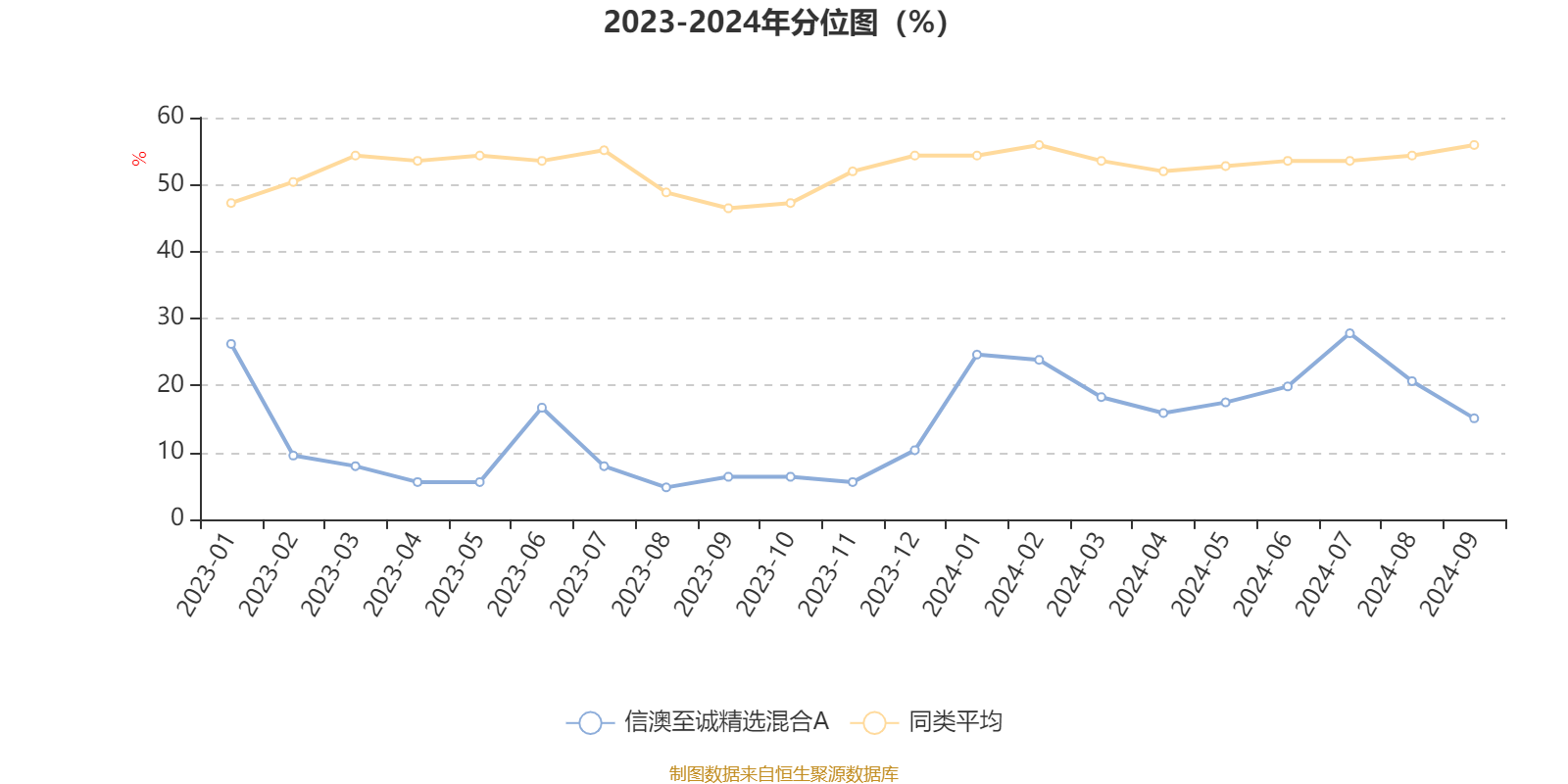 通过所选区间该基金净值增长率分位图,可以观察该基金与同类基金业绩比较情况。图为坐标原点到区间内某时点的净值增长率在同类基金中的分位数。