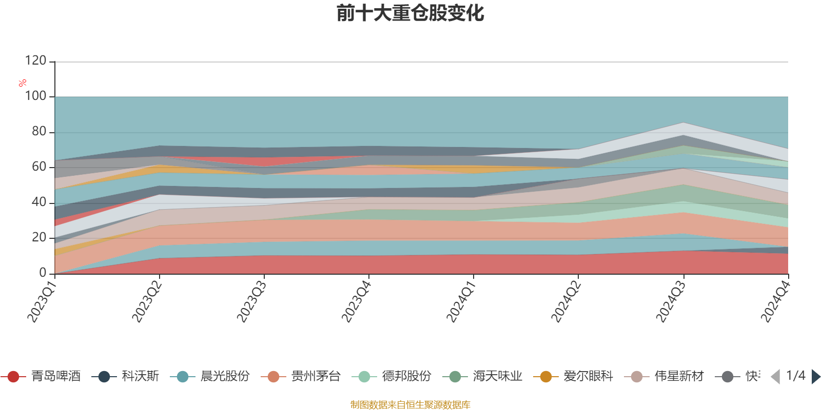 该基金持股集中度较高,近2年前十大重仓股集中度长期超过60%。截至2024年四季度末,基金十大重仓股分别是青岛啤酒、贵州茅台、海天味业、格力电器、海大集团、伟星新材、五粮液、德邦股份、科沃斯、南方航空。