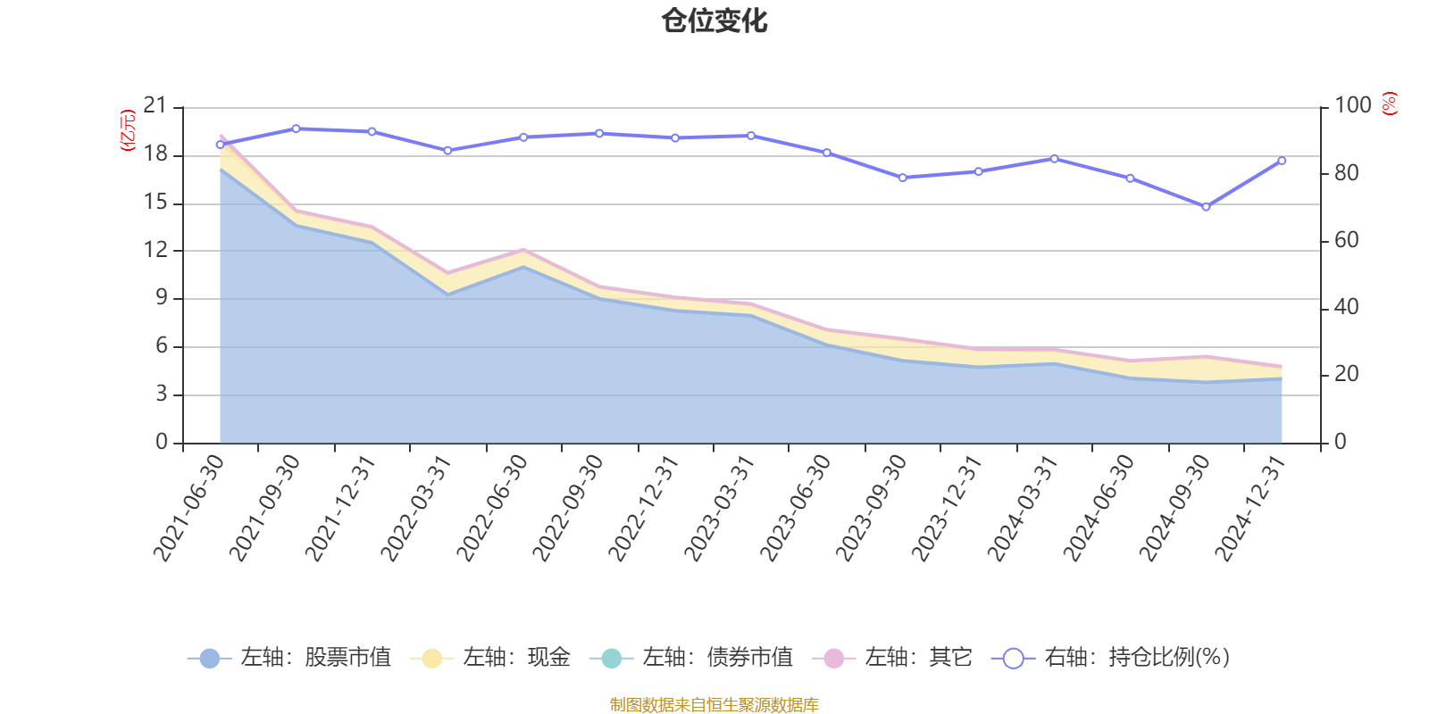 据定期报告数据统计,近三年平均股票仓位为84.73%,同类平均为85.62%。2021年三季度末基金达到93.59%的最高仓位,2024年三季度末最低,为70.34%。