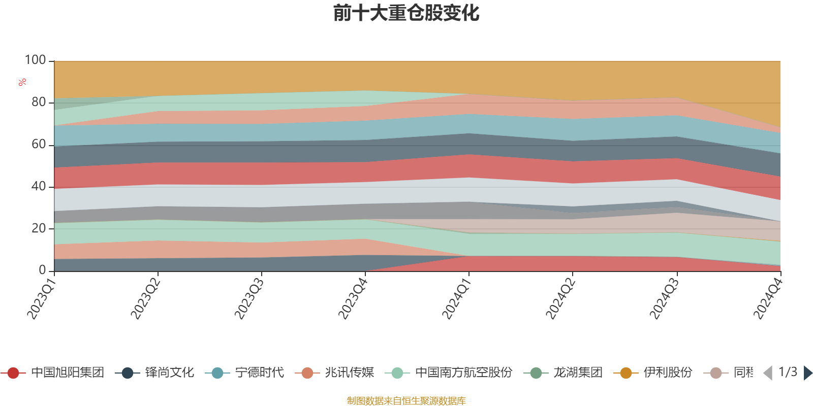 该基金持股集中度较高,近2年前十大重仓股集中度长期超过60%。截至2024年四季度末,基金十大重仓股分别是中国东方航空股份、中国国航、中国南方航空股份、春秋航空、华夏航空、同程旅行、贵研铂业、中国旭阳集团、宁德时代、伊利股份。