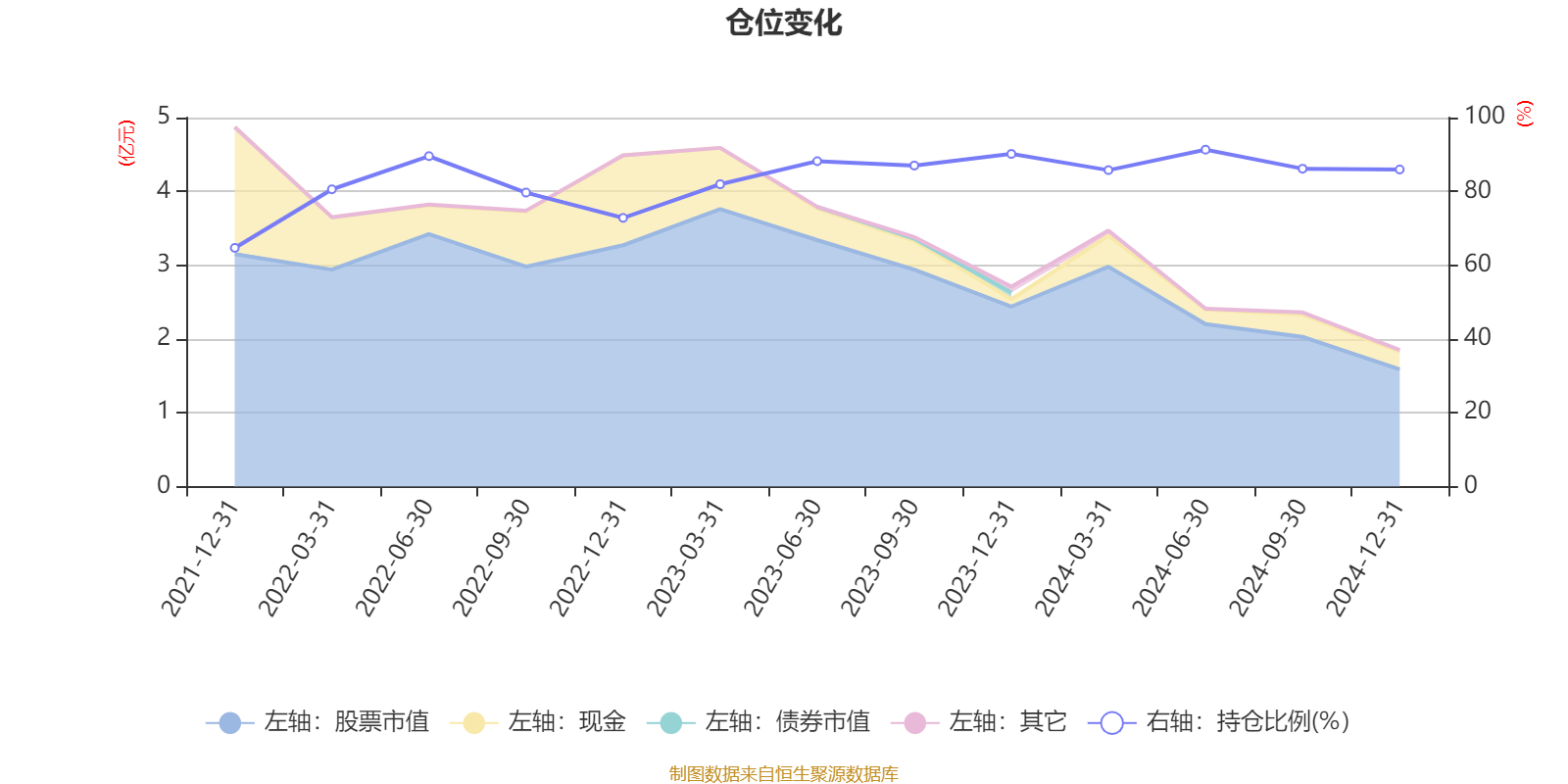 据定期报告数据统计,近三年平均股票仓位为84.92%,同类平均为84.96%。2024年上半年末基金达到91.31%的最高仓位,2021年末最低,为64.69%。