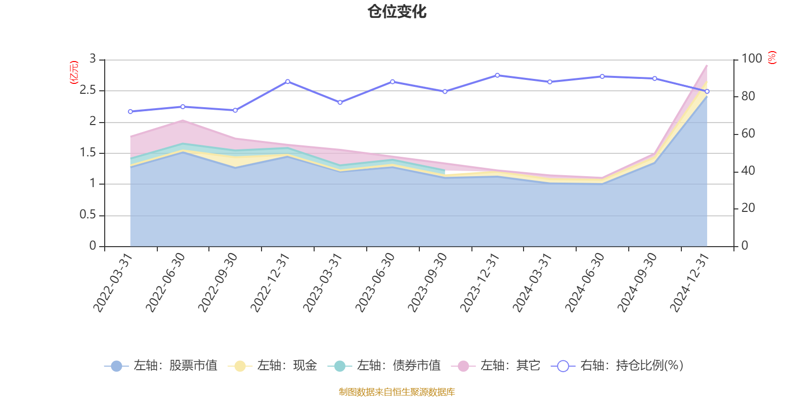 据定期报告数据统计,近三年平均股票仓位为83.29%,同类平均为83.33%。2023年末基金达到91.59%的最高仓位,2022年一季度末最低,为72.16%。