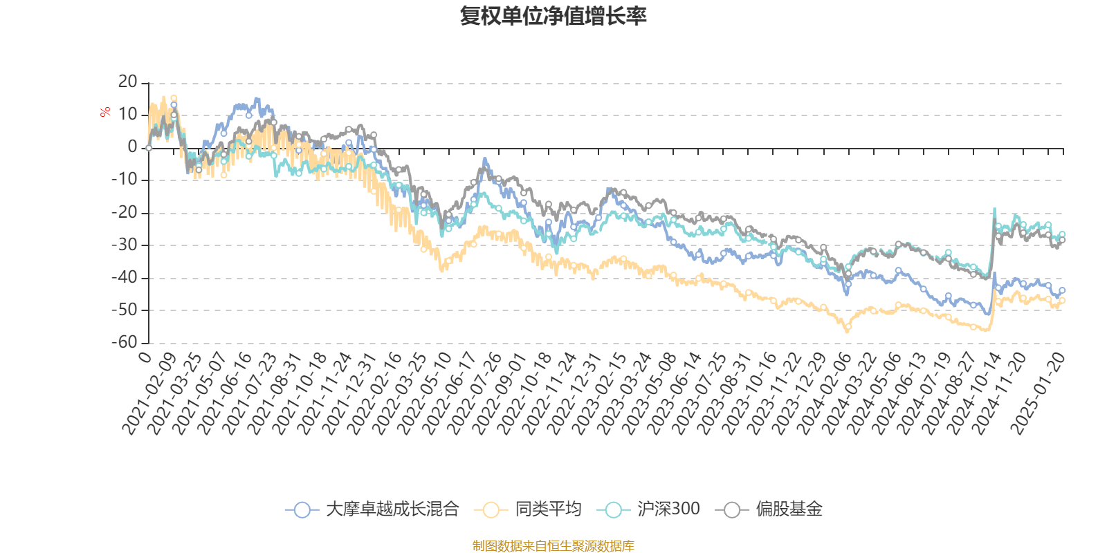截至1月20日,大摩卓越成长混合近三个月复权单位净值增长率为0.18%,位于同类可比基金277/646;近半年复权单位净值增长率为3.05%,位于同类可比基金500/645;近一年复权单位净值增长率为-7.11%,位于同类可比基金619/633;近三年复权单位净值增长率为-40.19%,位于同类可比基金399/444。