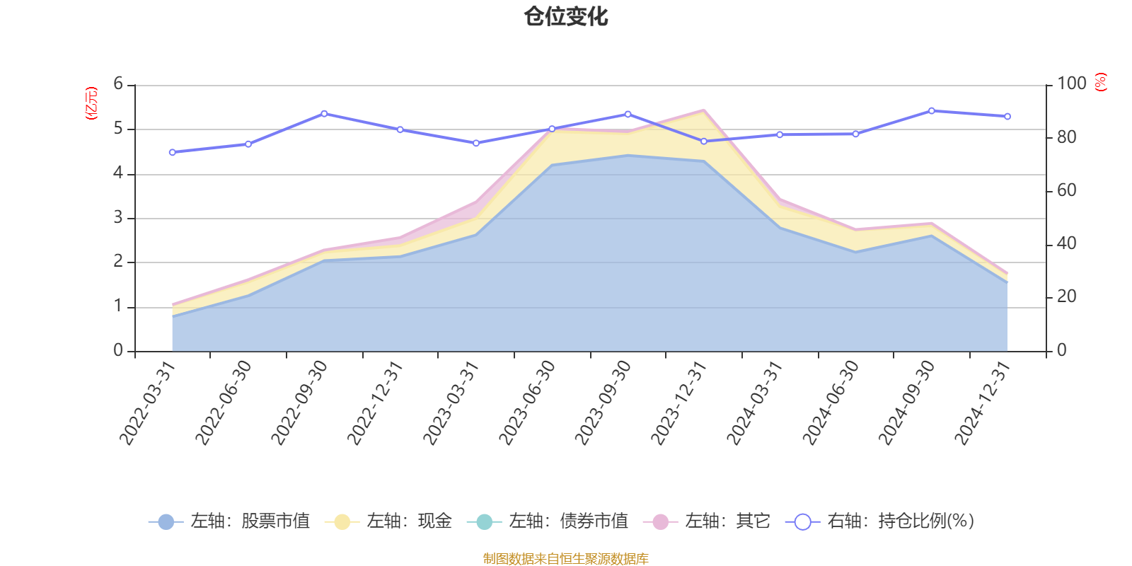 据定期报告数据统计,近三年平均股票仓位为82.98%,同类平均为86.5%。2024年三季度末基金达到90.28%的最高仓位,2022年一季度末最低,为74.68%。