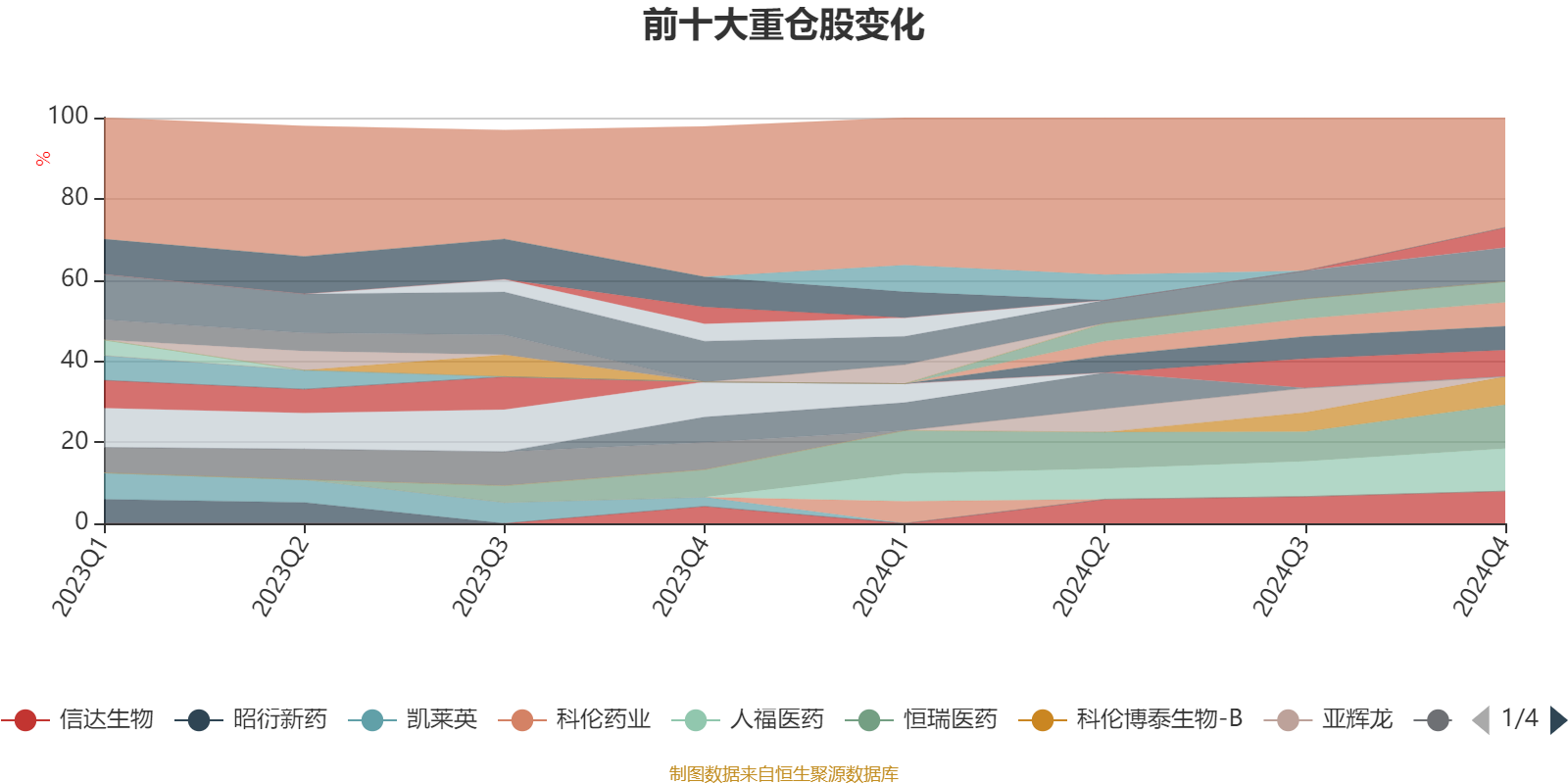 该基金持股集中度较高,近2年前十大重仓股集中度长期超过60%。截至2024年四季度末,基金十大重仓股分别是恒瑞医药、人福医药、药明康德、信达生物、科伦博泰生物-B、泰格医药、翰森制药、和黄医药、康诺亚-B、百济神州。