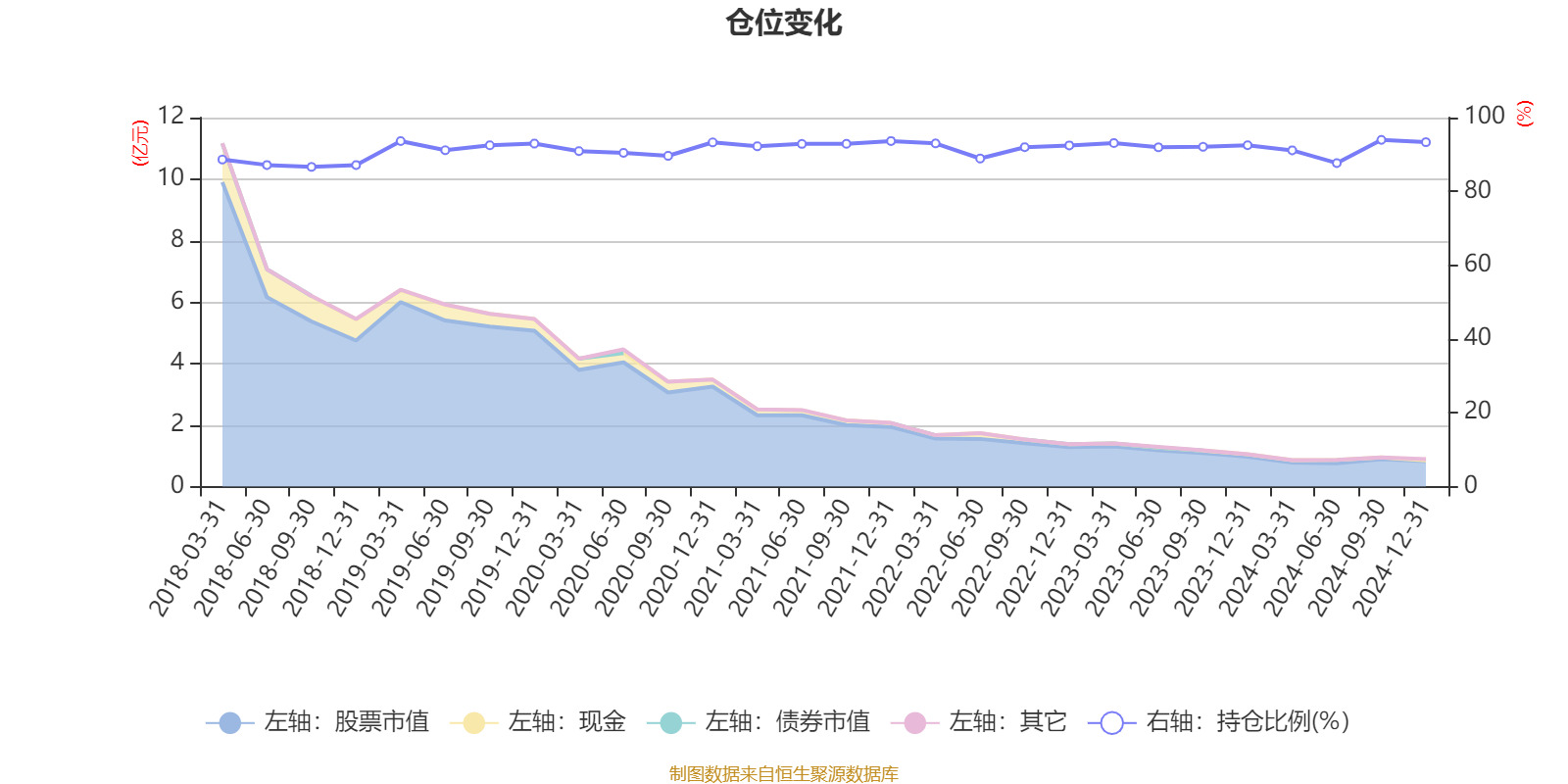 据定期报告数据统计,近三年平均股票仓位为91.84%,同类平均为83.32%。2024年三季度末基金达到93.97%的最高仓位,2018年三季度末最低,为86.63%。