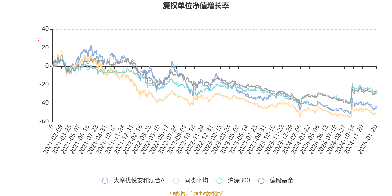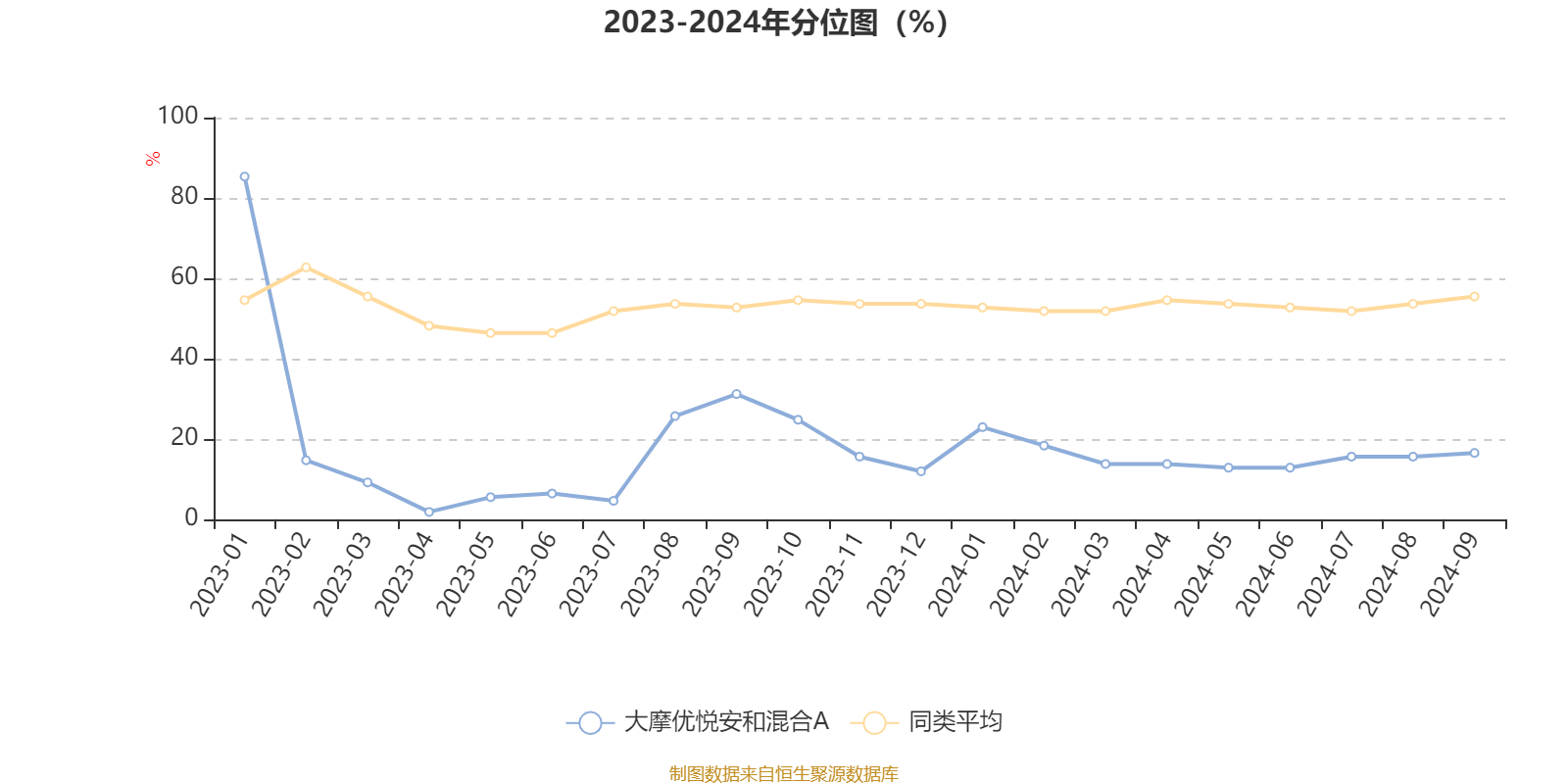 截至1月20日,大摩优悦安和混合A近三个月复权单位净值增长率为-3.93%,位于同类可比基金20/129;近半年复权单位净值增长率为3.43%,位于同类可比基金24/129;近一年复权单位净值增长率为-11.60%,位于同类可比基金91/127;近三年复权单位净值增长率为-43.35%,位于同类可比基金80/98。