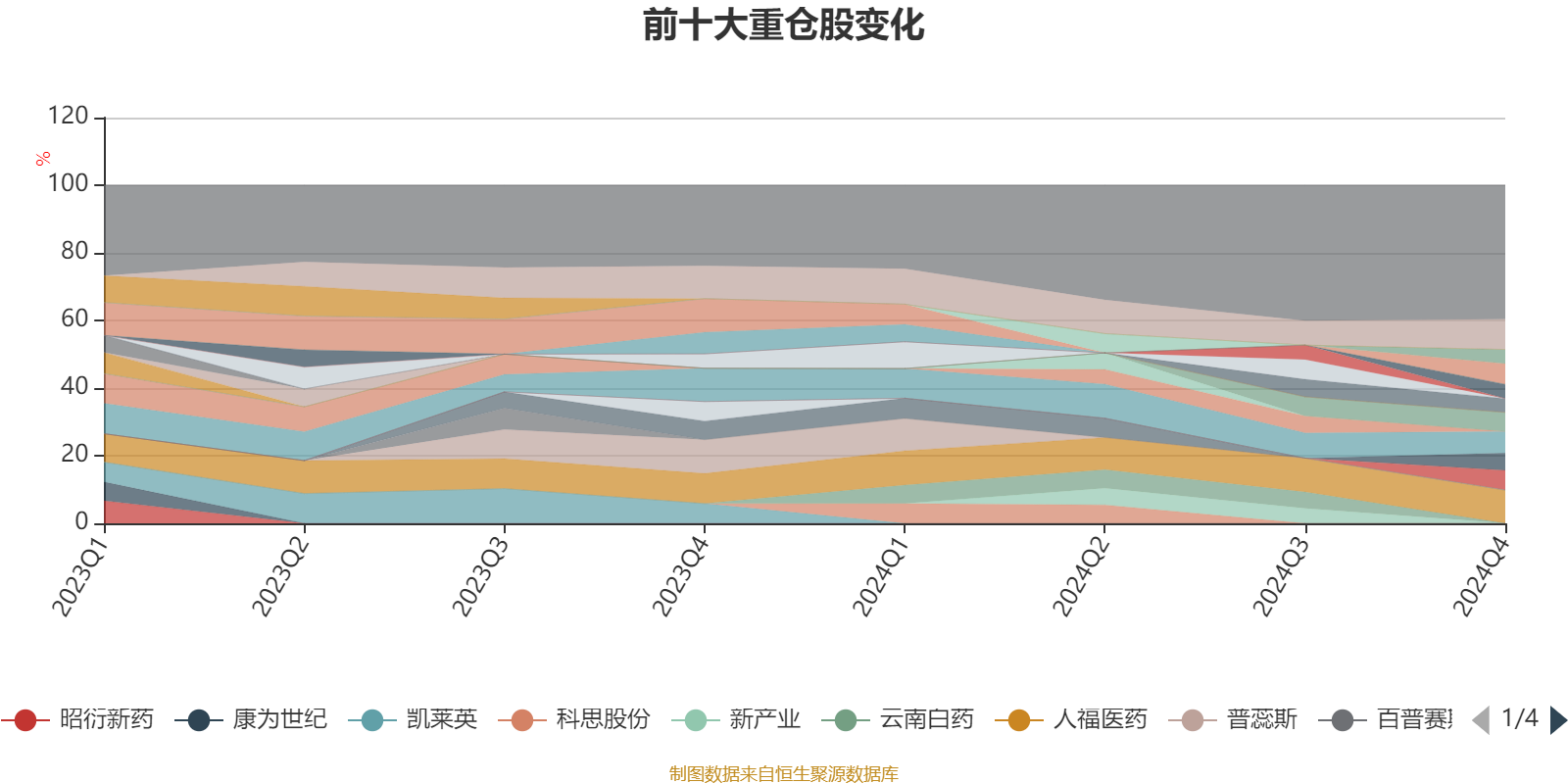 该基金持股集中度较高。截至2024年四季度末,基金十大重仓股分别是人福医药、恩华药业、迈瑞医疗、药明康德、贝达药业、振德医疗、派林生物、艾德生物、康龙化成、阿拉丁。
