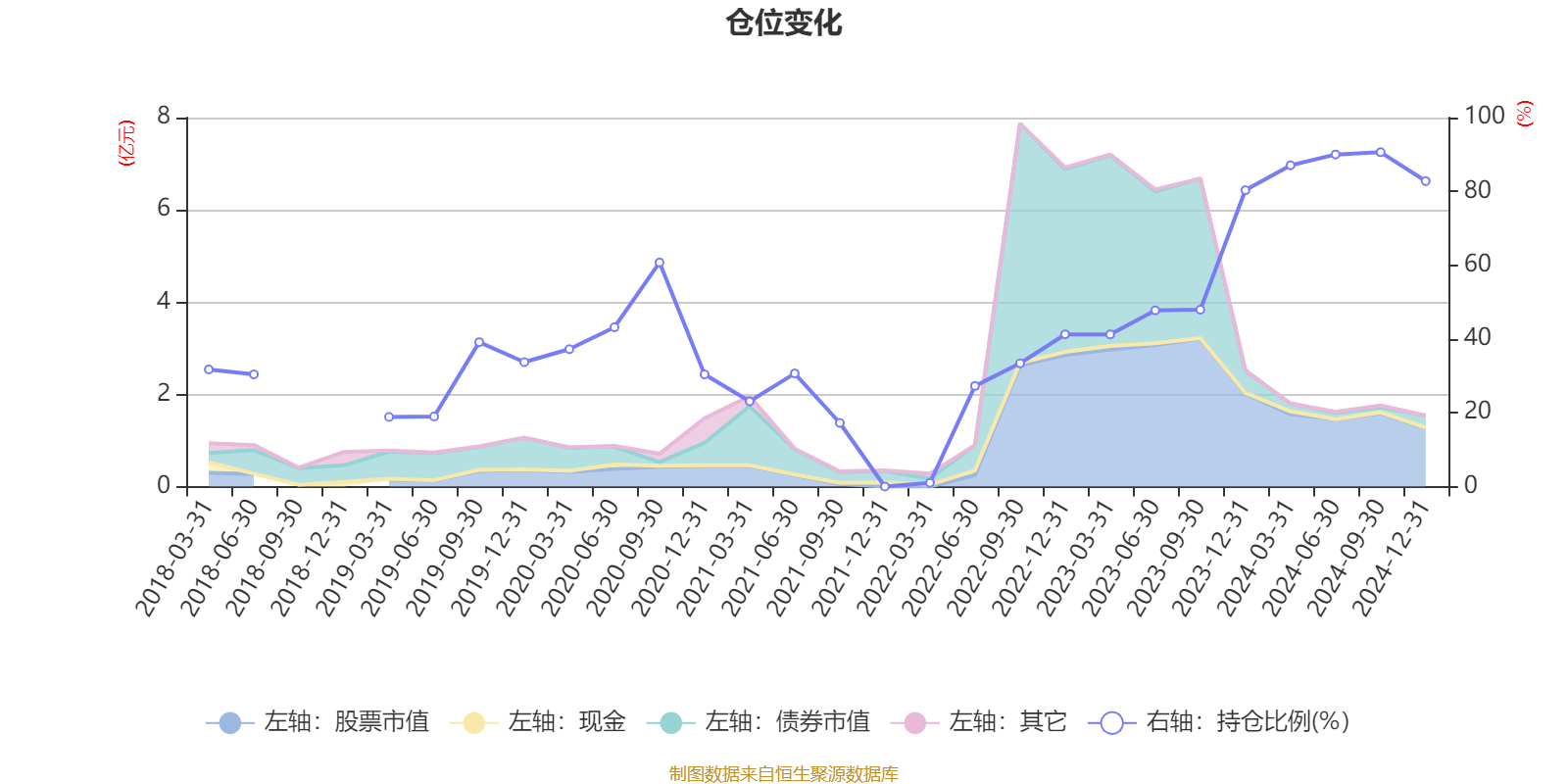 据定期报告数据统计,近三年平均股票仓位为55.89%,同类平均为79.89%。2024年三季度末基金达到90.61%的最高仓位,2021年末最低,为0.01%。
