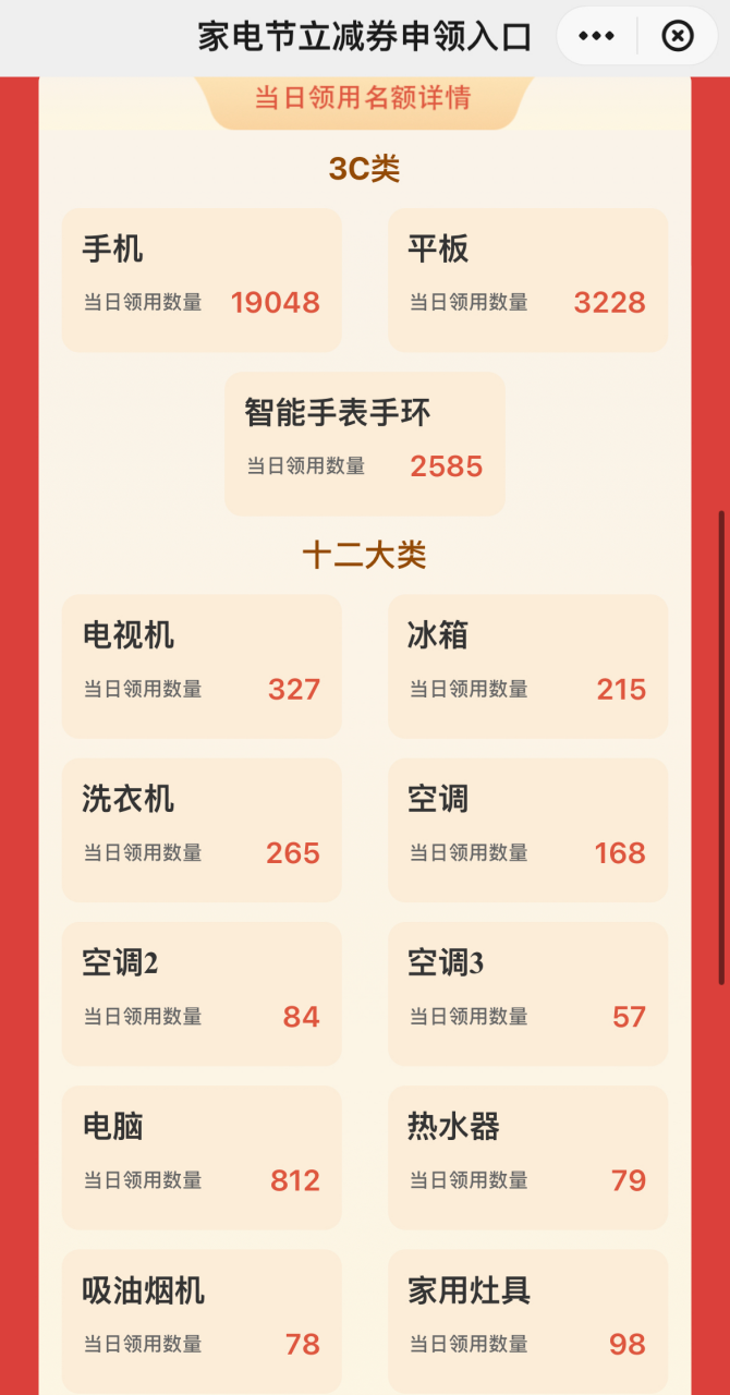 在深圳市,云闪付家电节立减券申领入口页面显示,截至1月20日21时42分,手机产品的消费券已被领取19048张,平板产品和智能手表手环产品的消费券分别被领取3228张和2585张。