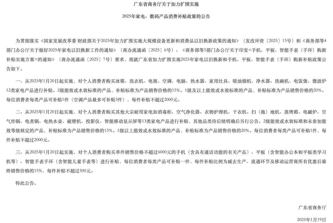 日前,广东省商务厅也发布《关于加力扩围实施2025年家电、数码产品消费补贴政策的公告》,公布了补贴细则,每位消费者单件产品最高补贴2000元。