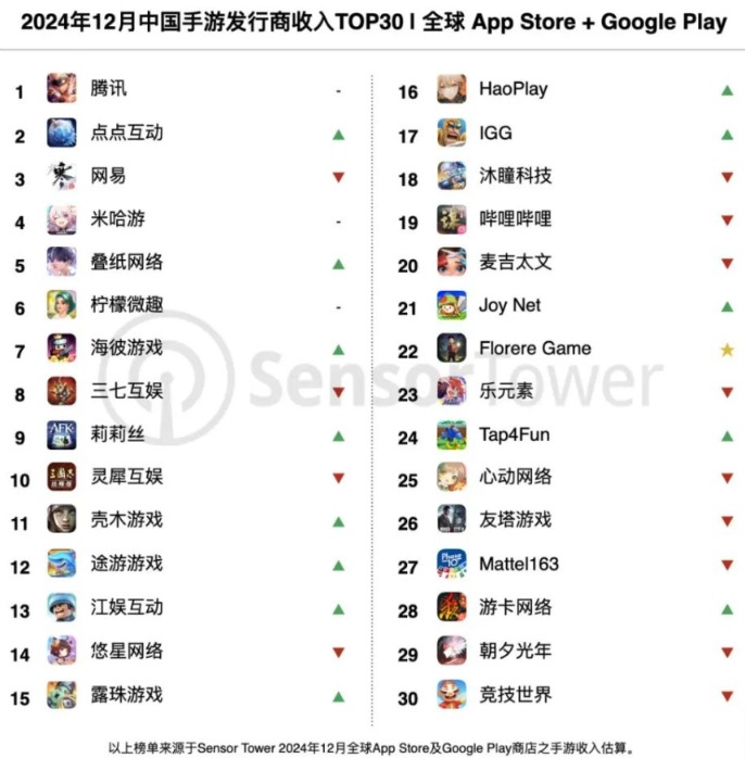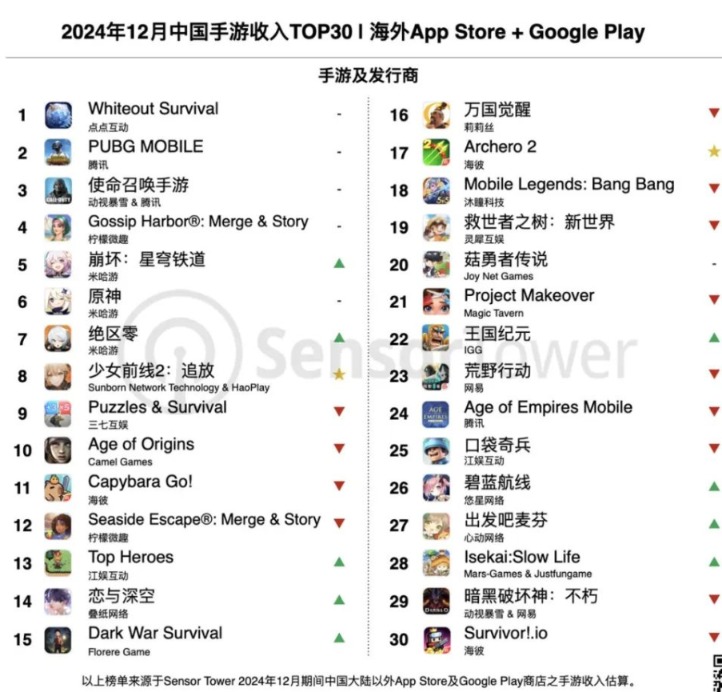 2024年12月,随着《Capybara Go!》中文版《冒险者日记》于12月初上线中国iOS市场,带动《Capybara Go!》全球收入增长24%;同时,《Archero 2》全球收入环比激增127%,共同推动海彼游戏收入增长34%,达历史新高,在Sensor Tower中国手游发行商全球收入榜排名前进1位至第7名。