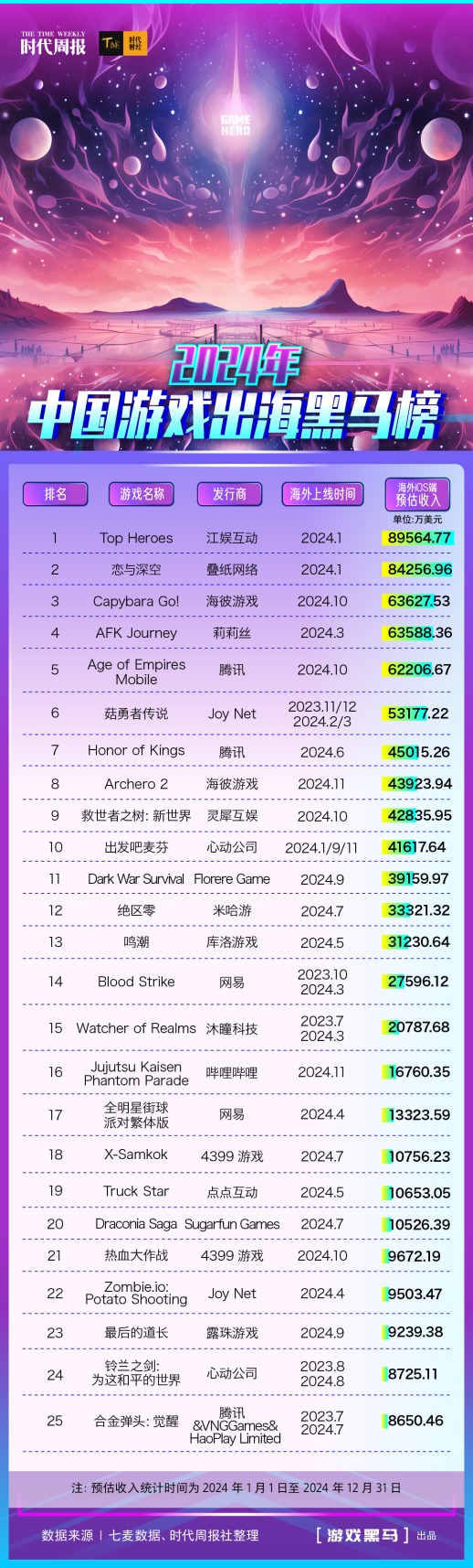 据时代周报发布的《2024年中国游戏出海黑马榜》,《Capybara Go!》《Archero 2》两款上线不久的新游“杀入”前十,分别位列第3位和第8位,2024年海外iOS端预估收入分别达到6.36亿美元(约为44.54亿元)、4.39亿美元(约为30.75亿元),合计达到10.75亿美元(约为75.29亿元)。