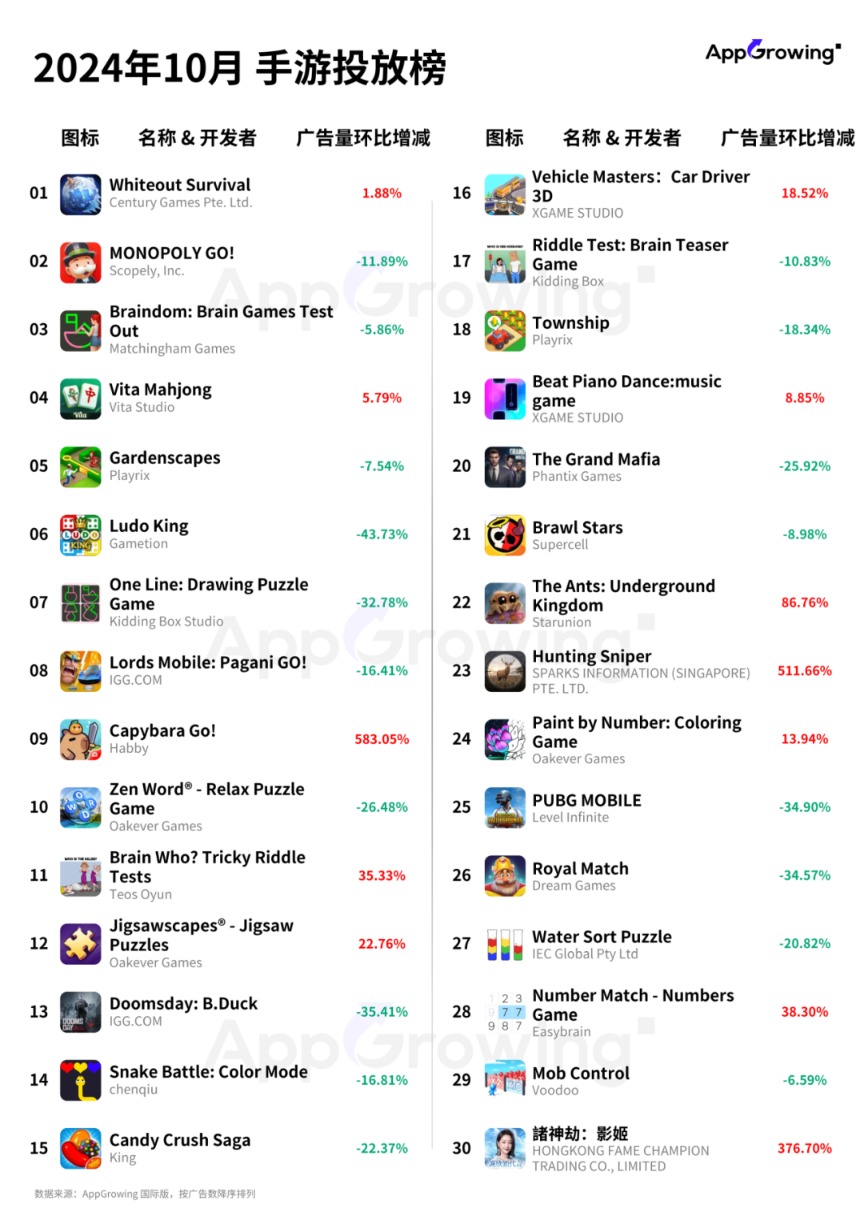 据AppGrowing国际版数据监测,海彼游戏新作《Capybara Go!》去年10月上线首月广告量环比暴增584.05%,空降2024年10月手游投放榜第9名。