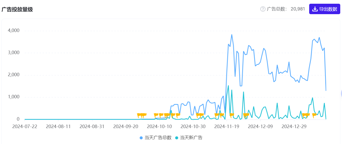 AppGrowing国际版监测数据显示,《Archero 2》在预约期只进行了小规模的买量投放,从2024年11月中下旬起才开始大规模买量,单日广告投放量一度超过3000组,同时还位列11月App Store和Google Play双端游戏预约榜前4位,预约中地区达到14个。