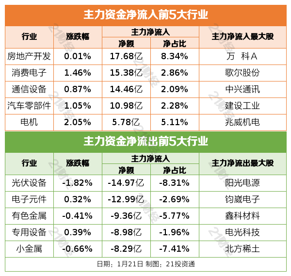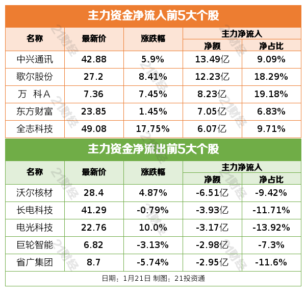 1月21日,A股收市,全天行情高开回落,三大指数涨跌不一,上证指数收跌0.05%,深证成指收涨0.48%,创业板指收涨0.36%;北证50收跌0.51%。当天,两市成交额12052亿元,较上一交易日放量223亿元;大盘资金净流出超143亿元。板块方面,半导体、游戏、电机、自动化设备、通信设备等行业及机器人、智能音箱、AI眼镜等概念涨幅居前。教育、光伏设备、服装家纺、厨卫电器等行业及转基因、石墨电极、PVDF、可燃冰等概念跌幅居前。