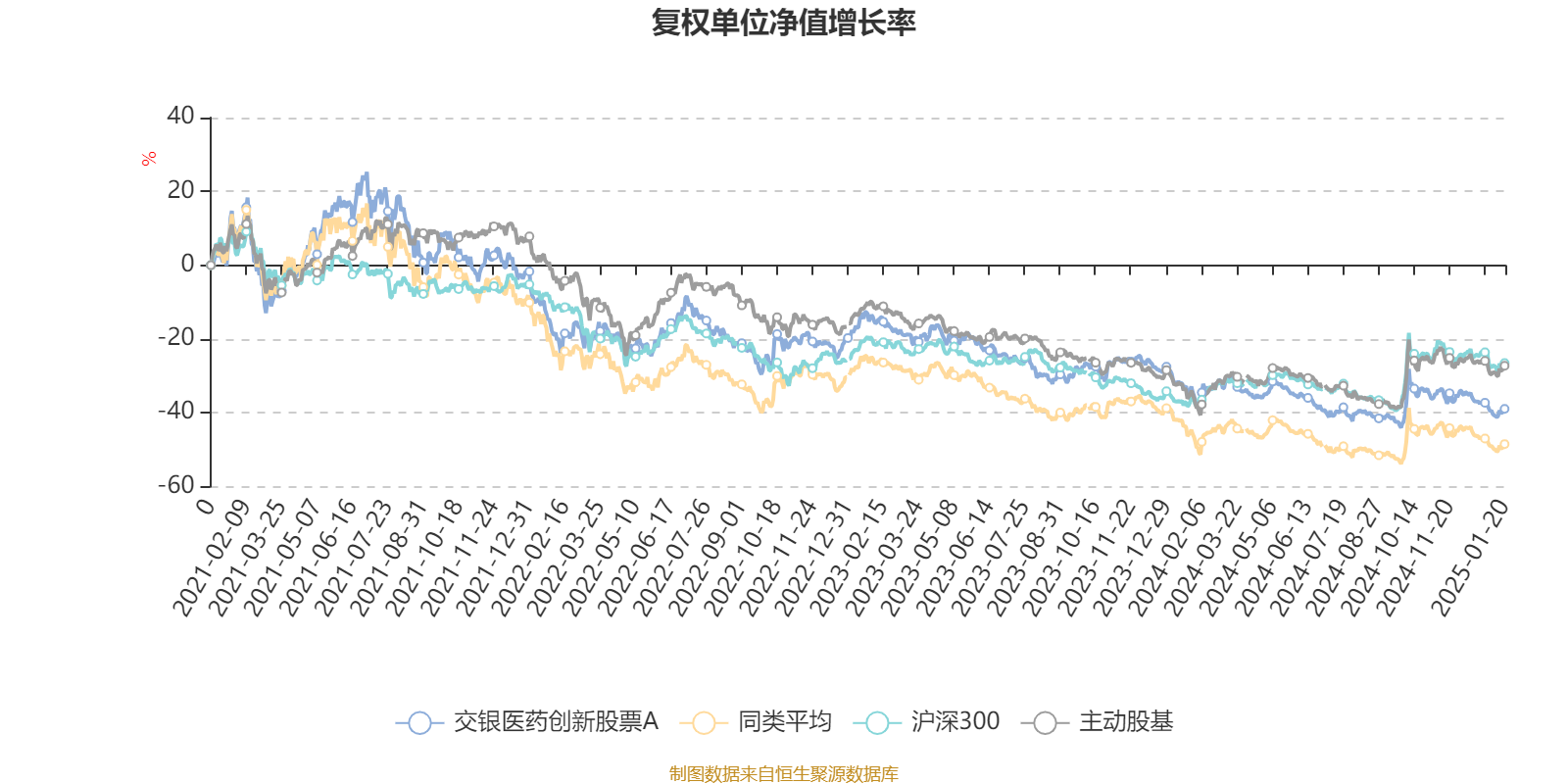 截至1月20日,交银医药创新股票A近三个月复权单位净值增长率为-7.32%,位于同类可比基金22/54;近半年复权单位净值增长率为-0.68%,位于同类可比基金34/54;近一年复权单位净值增长率为-9.08%,位于同类可比基金30/52;近三年复权单位净值增长率为-29.63%,位于同类可比基金12/43。