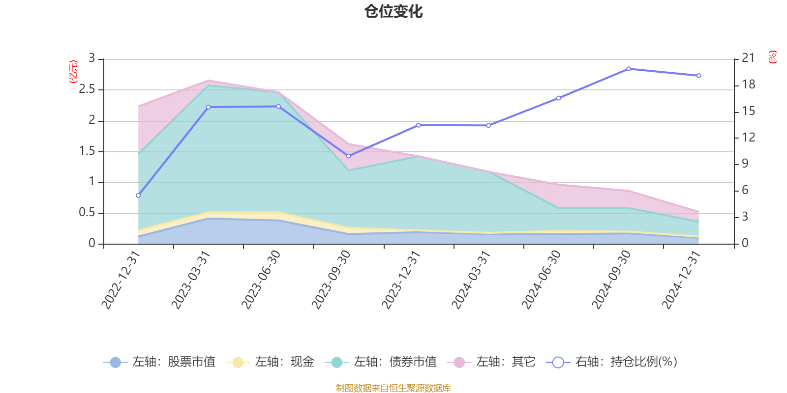 据定期报告数据统计,成立以来平均股票仓位为14.35%,同类平均为18.69%。2024年三季度末基金达到19.88%的最高仓位,2022年末最低,为5.5%。