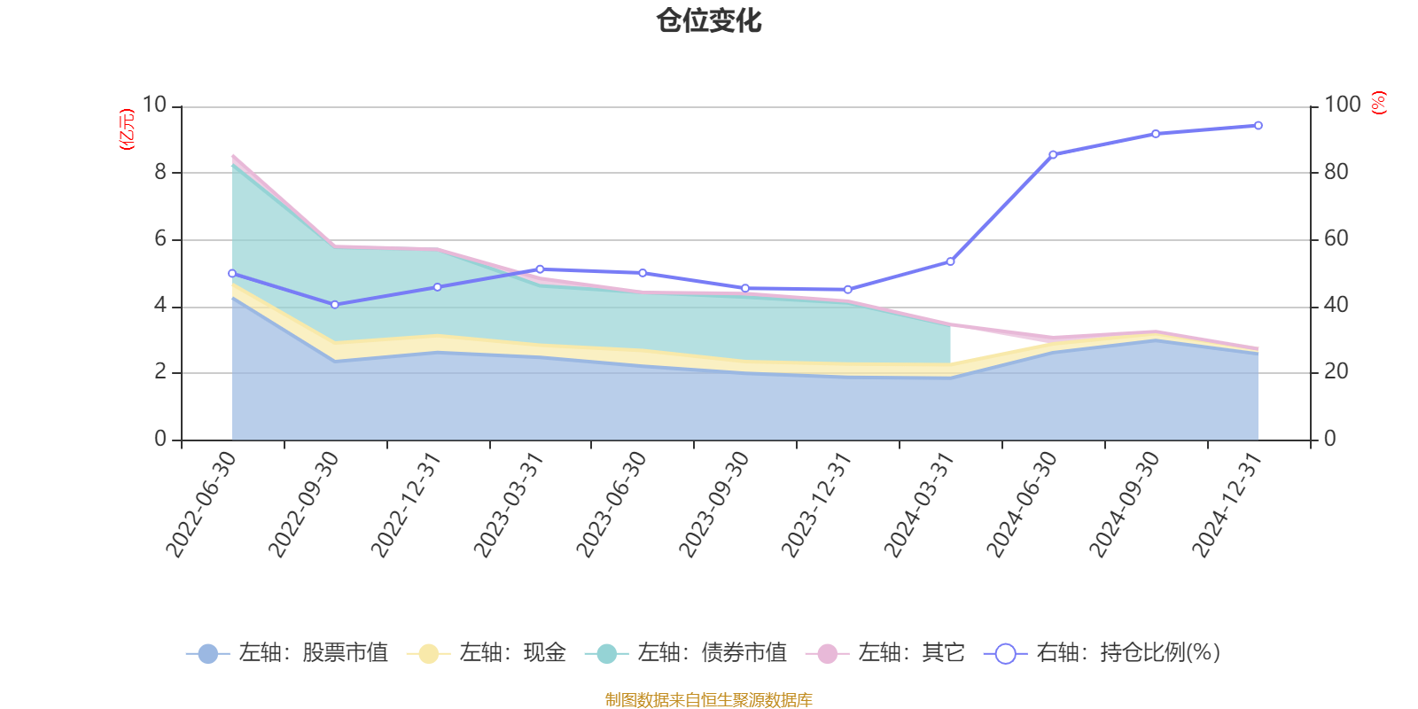 据定期报告数据统计,成立以来平均股票仓位为59.39%,同类平均为41.4%。2024年末基金达到94.28%的最高仓位,2022年三季度末最低,为40.58%。