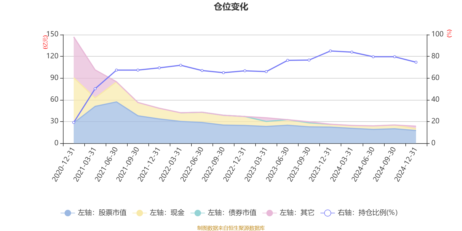 据定期报告数据统计,近三年平均股票仓位为74.38%,同类平均为85.87%。2023年末基金达到85%的最高仓位,2020年末最低,为19.2%。