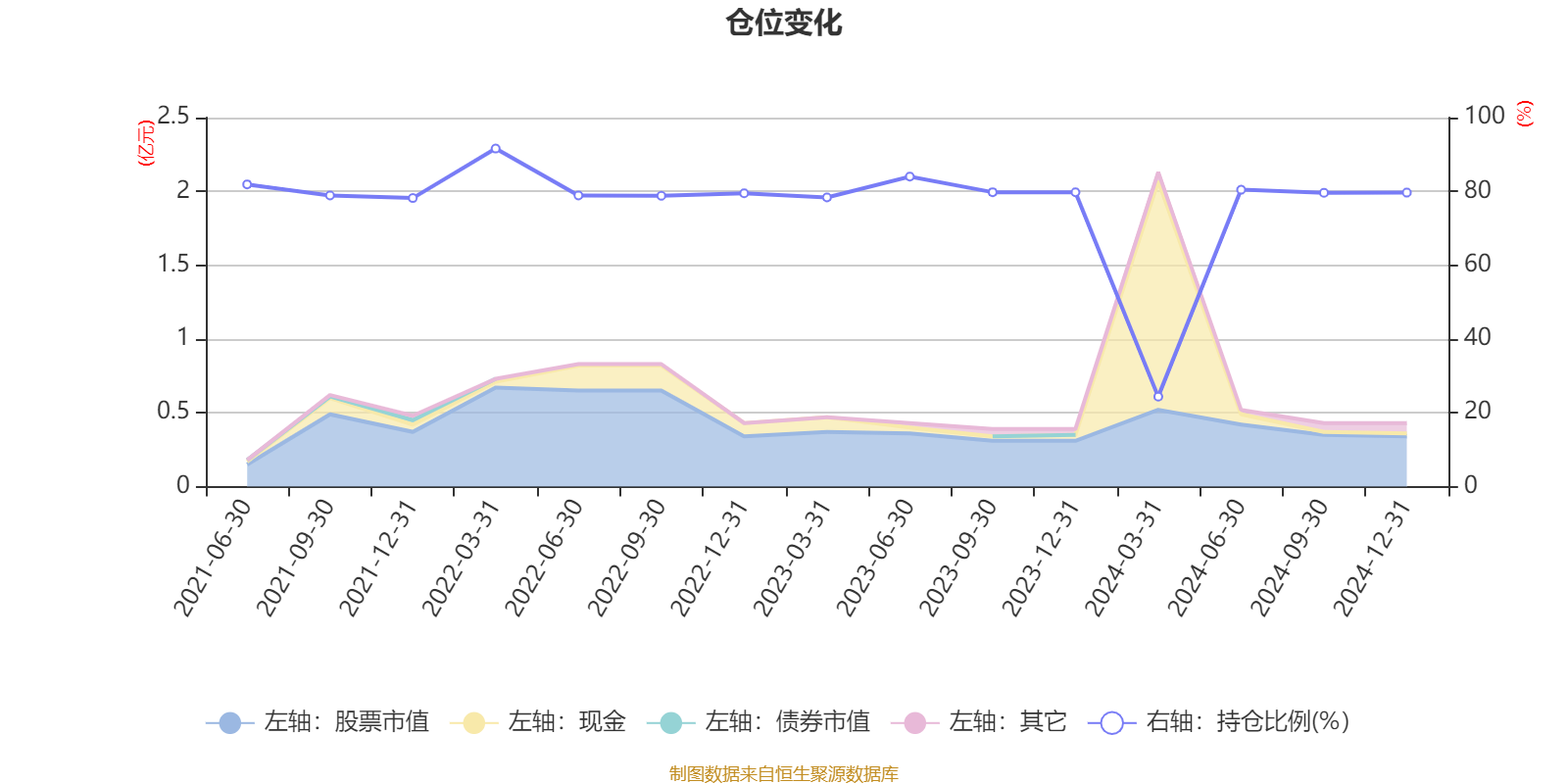 据定期报告数据统计,近三年平均股票仓位为76.24%,同类平均为88.12%。2022年一季度末基金达到91.61%的最高仓位,2024年一季度末最低,为24.38%。