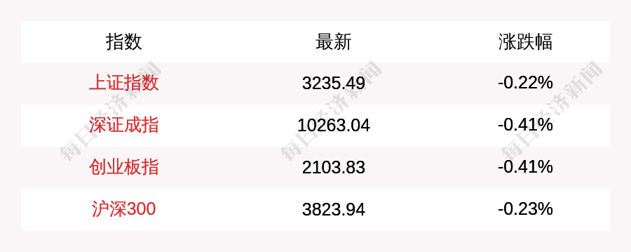 每经AI快讯:北京时间1月22日,上证指数开盘跌7.13点,跌幅为0.22%,报3235.49点;深证成指开盘下跌42.65点,跌幅为0.41%,报10263.04点;创业板指开盘下跌8.56点,跌幅为0.41%,报2103.83点;沪深300开盘下跌8.67点,跌幅为0.23%,报3823.94点。