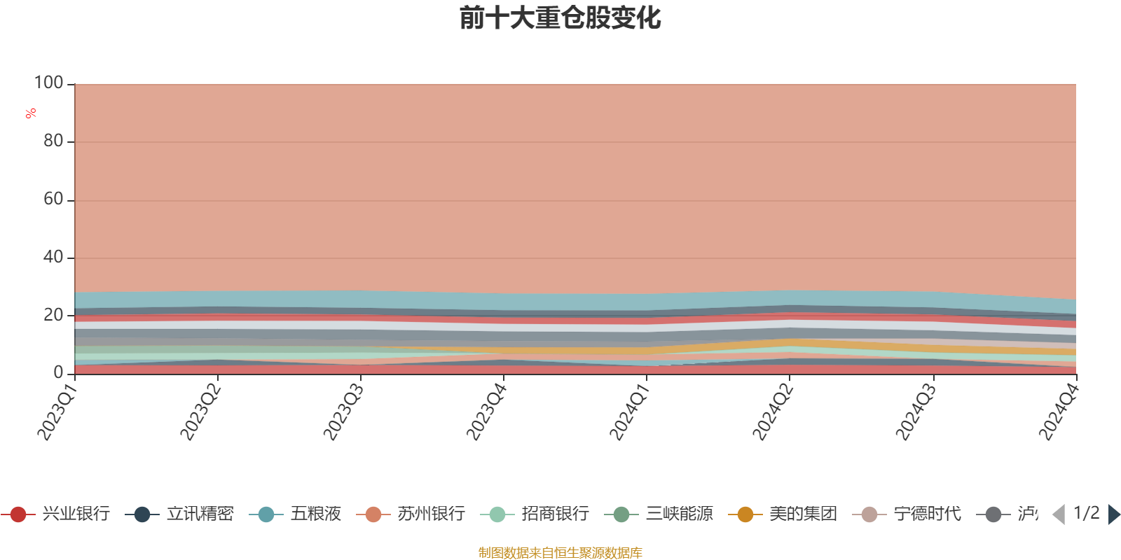 且持股标的较为稳定。截至2024年四季度末,基金十大重仓股分别是贵州茅台、长江电力、工商银行、伊利股份、中国平安、兴业银行、招商银行、美的集团、宁德时代、苏州银行。