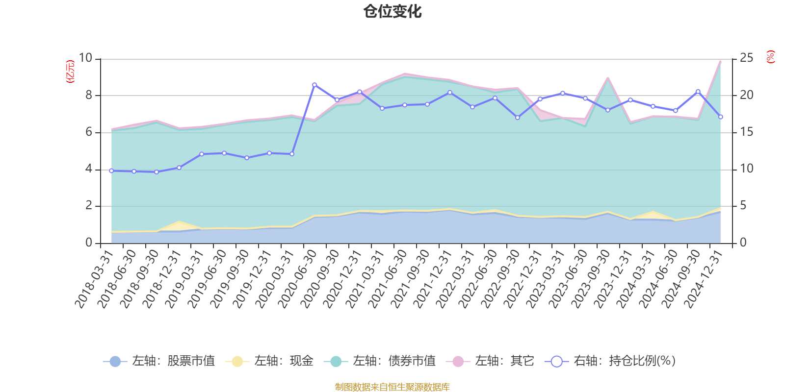 基金管理人在四季报中表示,四季度,本基金股票仓位相对较低。固定收益资产仓位以利率债和信用债投资为主。信用债以风险相对可控、性价比合适的中等久期优质国企信用债为主,转债方面,组合主要参与一级市场转债申购套利。杠杆方面,考虑到资金价格偏高,短债的息差性价比一般,报告期内组合维持适度杠杆。股票投资组合仍然以传统蓝筹为主,并继续综合考虑公司治理、盈利能力、成长性、资产质量、估值等因素选择标的,同时保持行业均衡和分散持仓。