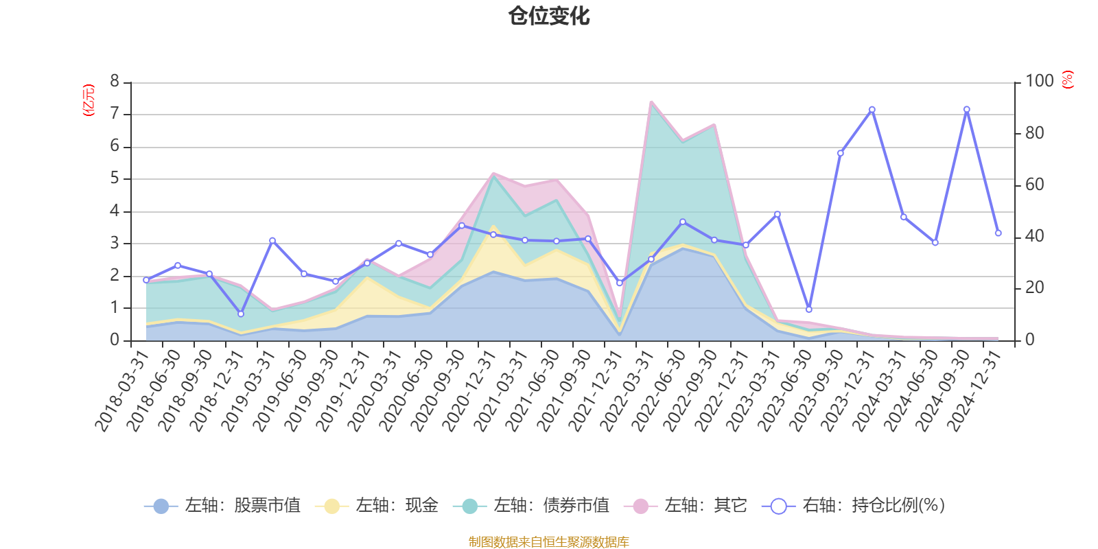 据定期报告数据统计,近三年平均股票仓位为49.49%,同类平均为79.89%。2024年三季度末基金达到89.56%的最高仓位,2018年末最低,为10.36%。
