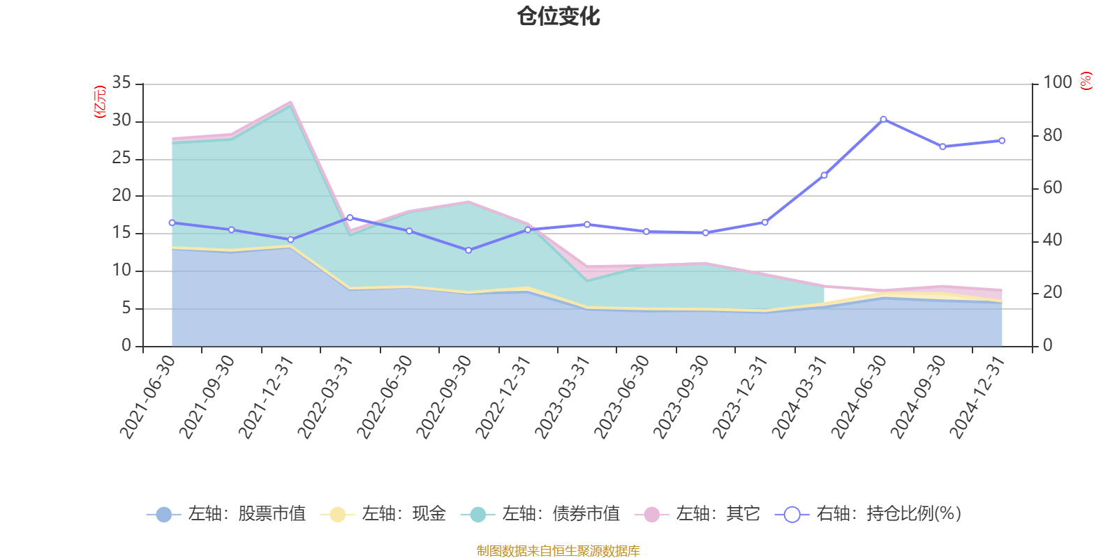据定期报告数据统计,近三年平均股票仓位为55.04%,同类平均为41.4%。2024年上半年末基金达到86.45%的最高仓位,2022年三季度末最低,为36.57%。