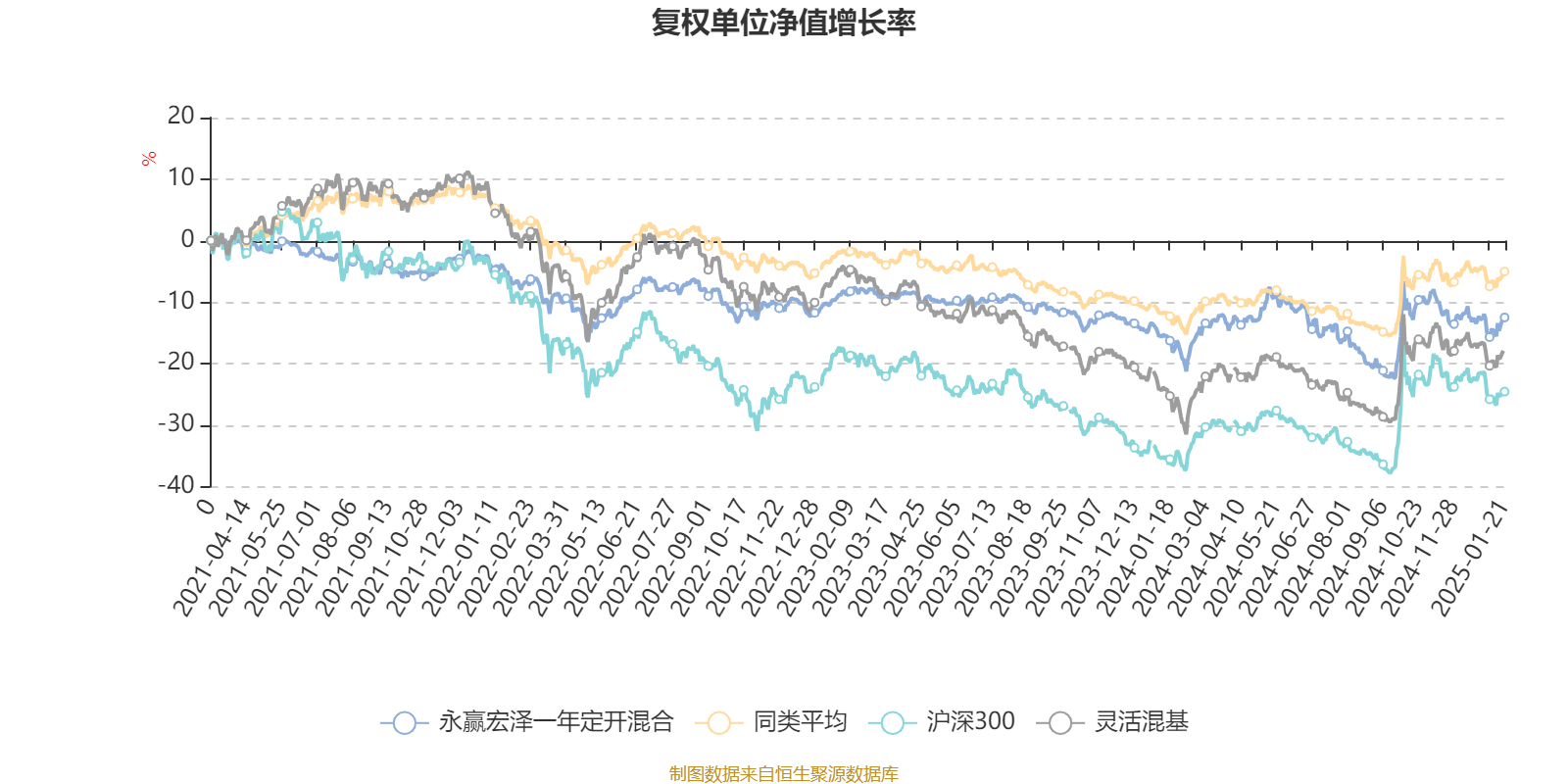 截至1月21日,永赢宏泽一年定开混合近三个月复权单位净值增长率为-2.19%,位于同类可比基金83/108;近半年复权单位净值增长率为1.37%,位于同类可比基金78/108;近一年复权单位净值增长率为4.82%,位于同类可比基金62/108;近三年复权单位净值增长率为-7.64%,位于同类可比基金60/107。
