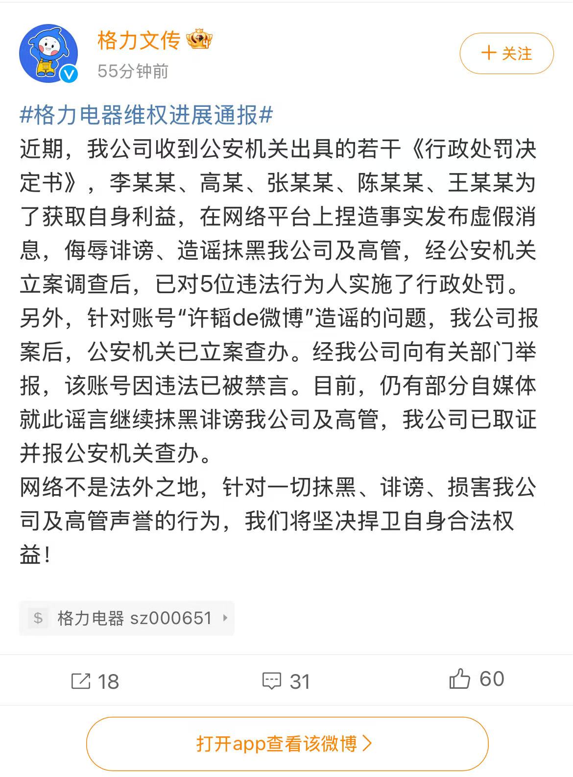 格力电器:5位造谣者已被行政处罚,造谣账号已被禁言
